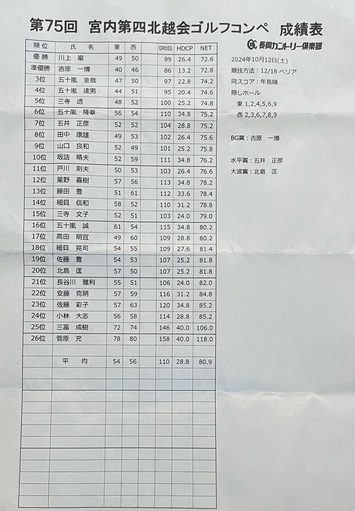 | 北島 匡 | 6 | 5 | 5 | 6 | 4 | 5 | 6 | 6 | 7 | 50 | 107 |