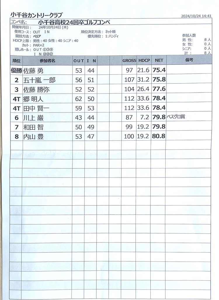 | スコア詳細 小千谷高校の同級生コンペ。今回は2日目で8人が参加。同組メンバーと気楽に会話品がらラウンドできました。このところ大たたきをするホールが多く、アイアンも精度がでないので、力まずグリーンオンを目指したのが良かったのか、久々に50%のパーオン率になりました。しかし、3パットとOBは苦手のホールで出てしまい、少し残念です。 それでも、喉風邪が治らず、体調に不安があるなかで、楽しくプレイ出来て良かったです。今年のコンペは次回が最後。アイアン精度を上げて気持ち良く回りたいものです。 1H 1W↑FW。4U←木ラフ。7I→FW。AW↓15mオン。2P。 2H 1W↑FW。4U↑↓20mオン。1P↓2m。3P。 3H 7I→バンカー。SW↑4mオン。1P。 4H 1W→ラフ。11I↓10mオン。2P。 5H 1W↑FW。9I↓15mオン。1P↓2m。3P。 6H 1W→FW。8I←10mカラー。P↓2m。2P。 7H 1W→OB。前進4打4U→ラフ。AW↓10mオン。2P。 8H 7I→15mオン。2P。 9H 1W→OB。前進4打11I←15mオン。2P。 10H 1W←ラフ。7Iトップ↓ラフ。SW←4mオン。1P。 11H 1W↑FW。8I←15mオン。1P↓2m。3P。 12H 1W↑FW。9I↓5mオン。2P。 13H 6Iトップ↓ラフ。AW↓花道。AW↓15m。2P。 14H 1W↑FW。4U↑FW。5U↑30m→オン。1P↓3m。3P。 15H 1H→ラフ。5U←ラフ。SW↓10mオン。2P。 16H 1W↑FW。5U→斜面。SW↓カラー。P↓5mオン。2P。 17H 6I←5mオン。2P。 18H 1W←バンカー。5U↓セミラフ。4U←ラフ。SW←5mオン。 コンペ順位 |