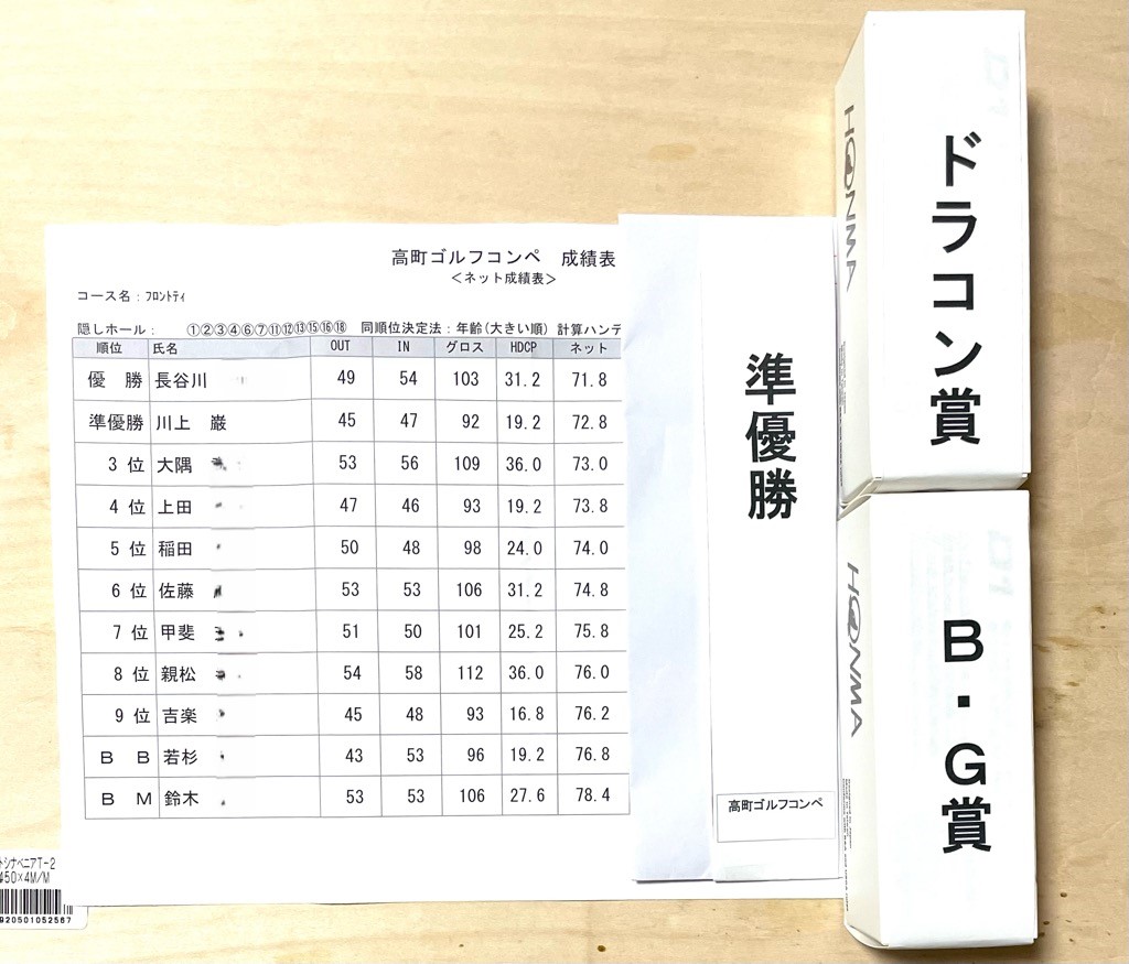 | 高町町内秋季コンペ。2日連続のプレイなので体力的に心配していましたが、腰の疲労はほとんど感じず無事に回り切りました。天気は終日曇り、気温は10℃→18℃で快適でした。グリーンが10.5フィートの設定、カップもほとんどが端に切ってあり難しい設定でした。ショットはアイアンでダフリが多く、イマイチな感触でしたが、ユーティリティが当たってくれたのでスコアはまずまずでした。前半は15番でバンカーで欲張りミス。17番は7番アイアンでチョロ。後半はティーショットが左右にぶれたりチョロったり。何とか上がりで戻しましたが、90を切れなくて残念でした。 コンペの結果は準優勝、ドラコン、ベスグロ賞でした。 10H 1Wチョロ←カート道。4U↓バンカー。7Iアゴ↓ラフ。7I↑FW。11I←2mオン。1P。 11H 1W←↑FW。5U↑ラフ。AW←2mオン。2P。 12H 1W↑FW。6I→↓FW。AW→3m。2P。 13H 4U↓30mオン。1P↓5m。3P。 14H 1W↑→ラフ。7I↑5mオン。2P。 15H 1W←↓バンカー。8Iダフリ↓バンカー↑ラフ。AW↓←ラフ。AW←ラフ。8I↑カラー。2P。 16H 1W↓FW。7Iシャンク→ラフ。9I↑3mオン。1P。 17H 7Iチョロ↓ラフ。AW↓花道。AW↑5mオン。2P。 18H 1W←ラフ。4U↑FW。4U→ラフ。SW↓10mオン。3P。 1H 1W↑FW。4U↓花道。9I←3mオン。2P。 2H 6I←↑カラー。1P←3mオン。2P。 3H 1W↑FW。8Iダフリ←花道。AW↑10mオン。2P。 4H 3Wチョロ↓FW。4U↑FW。SWトップ↑斜面。SW↑10mオン。2P。 5H 1W←ラフ。10I↓花道。9I↑5mオン。2P。 6H 1W←バンカー。AW↓FW。AW←↑5mオン。1P↑4m。3P。 7H 1W→↓林。AWダフリ↓斜面。AW↓ラフ。10I←3mオン。2P。 8H 9I←↑カラー。1P↓1m。2P。 9H 1W→ラフ。4U↑FW。AW←↓10mオン。1P↑3m。2P。 |
